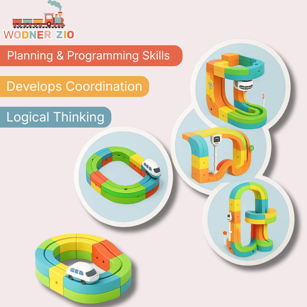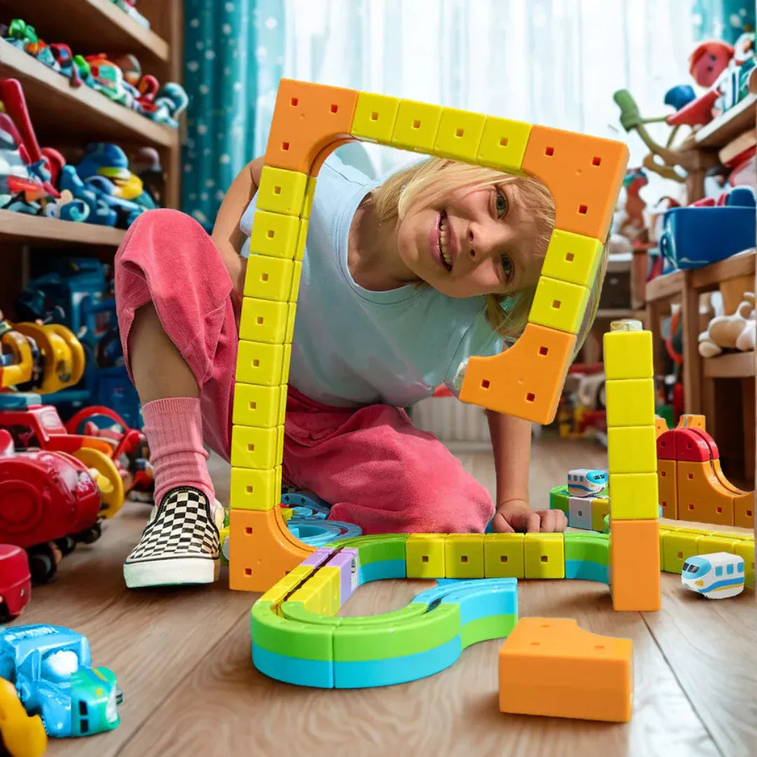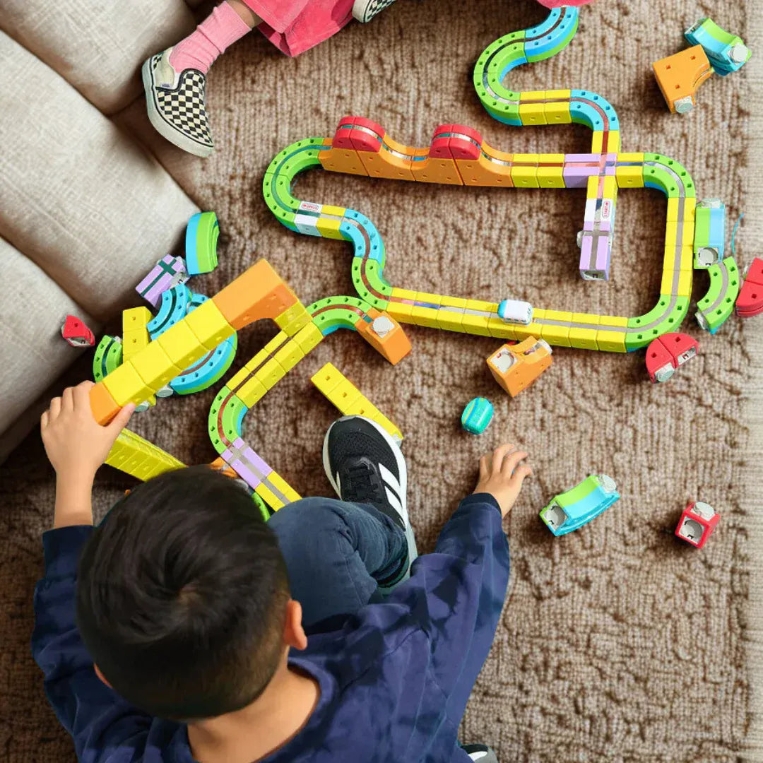 Kids decide what to build — a tall structure, a twisty track, or a long bridge — and everything connects effortlessly.