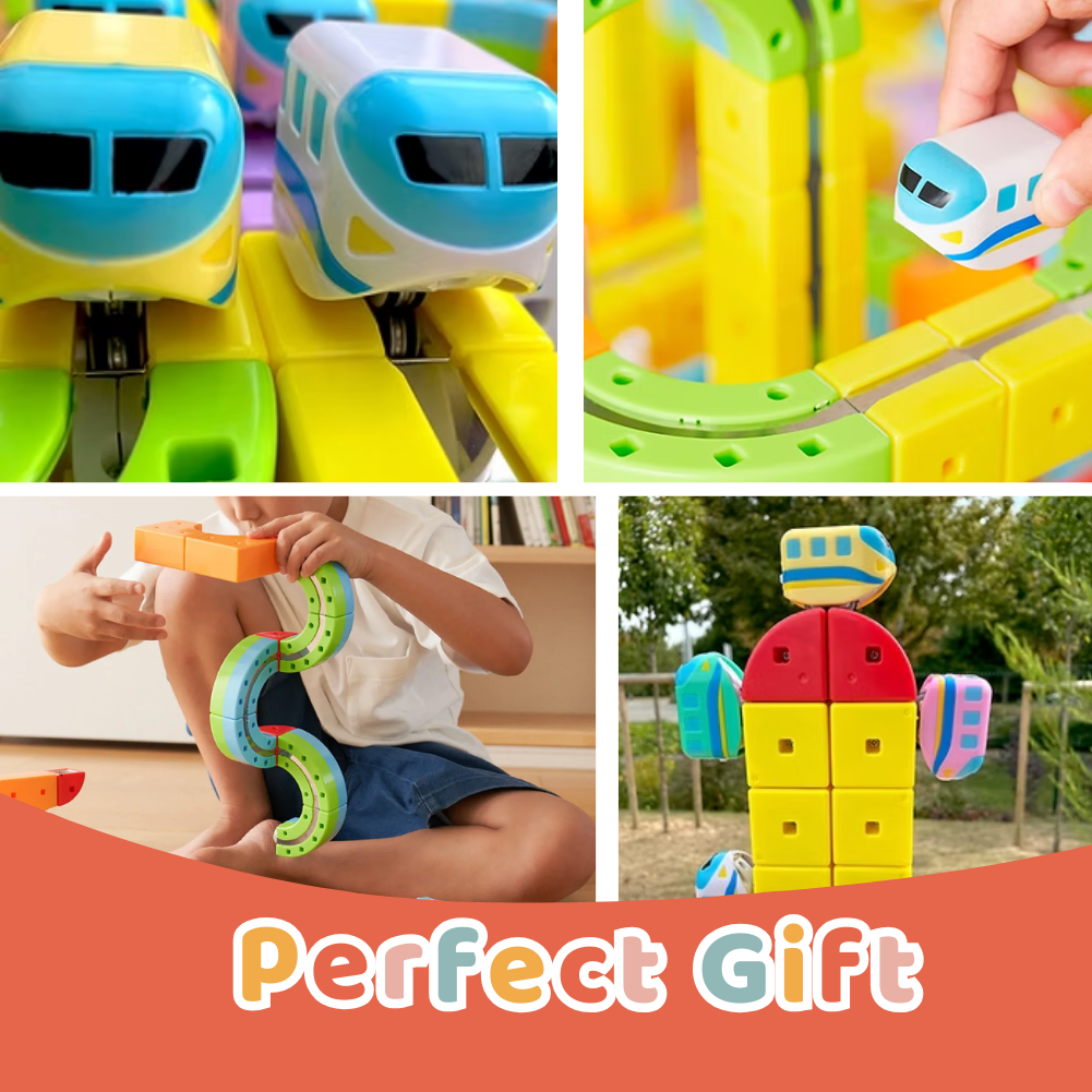Kids can build tall tracks, crazy turns, bridges, and creative pathways… then place the train on top and watch it glide smoothly across the track they designed.